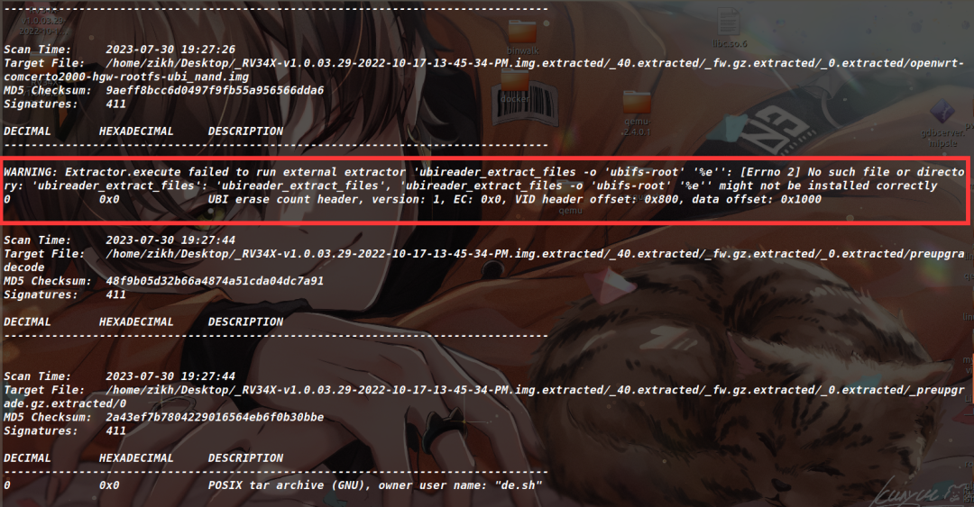 执行后发现没有找到解压出来的文件系统,然后看一下binwalk给的warning(如下),说是执行失败ubireader_extract_files程序。