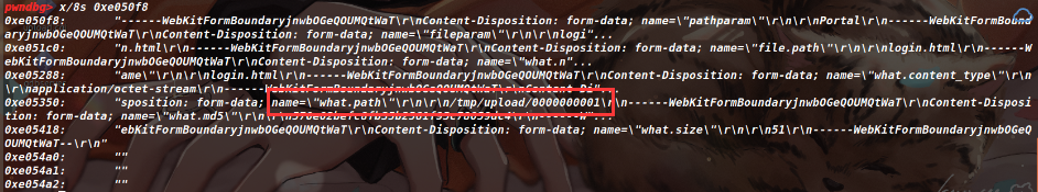 因为程序中读入数据的只有fread,所以假定这里是读入POST请求,接着先来写一个报文发过去调试一下,这里要控制pathparam和fileparam为上面我们指定的值,至于那个file.path是什么还不知道,这里都一起发过去试试。(由上图中通过定位boundary=字符串获取报文分隔符,结合该cgi的具体功能文件上传,可知该报文需要以表单格式multipart/form-data发送POST请求)。
