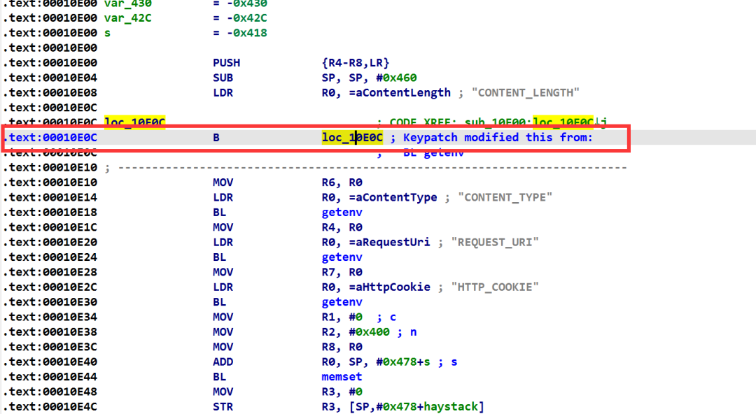 然后现在把0x10E0C这个地址存放的指令BL getenv改成B 0x10E0C这样就可以让进程upload.cgi陷入死循环(使用插件keypatch进行修改)。