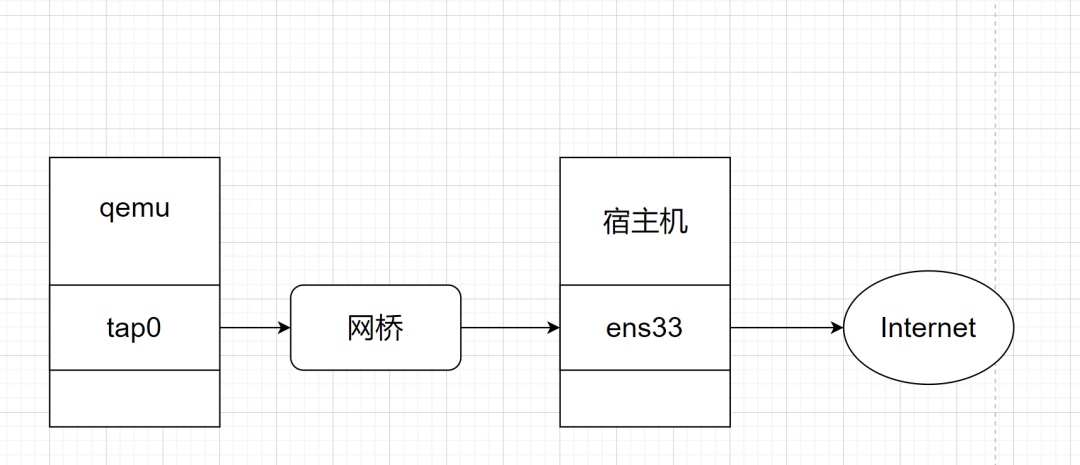 因为之后需要用scp传文件以及启动服务等操作肯定是需要配置qemu模拟环境网络的,大概原理就是设置一个网桥,然后开一个接口,把这个接口给qemu,然后流量的发送都通过这个网桥,画成图的话就是下面这个样子。