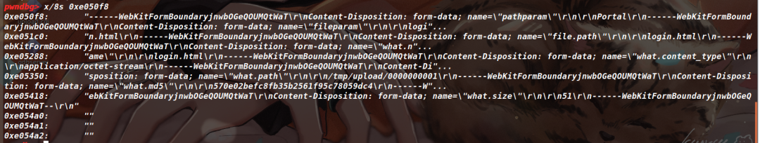 下面我直接说解析字段的结论,如果有想弄清过程的师傅可以自己调试一下。这个multipart_parser_execute函数是将POST报文进行了字段的解析,就大概是做了一个键值对出来,可能用结构体来实现的(反正调试看到的是用多个堆块通过指针的方式,将键和值做一个匹配)。