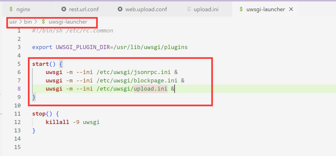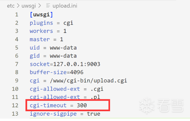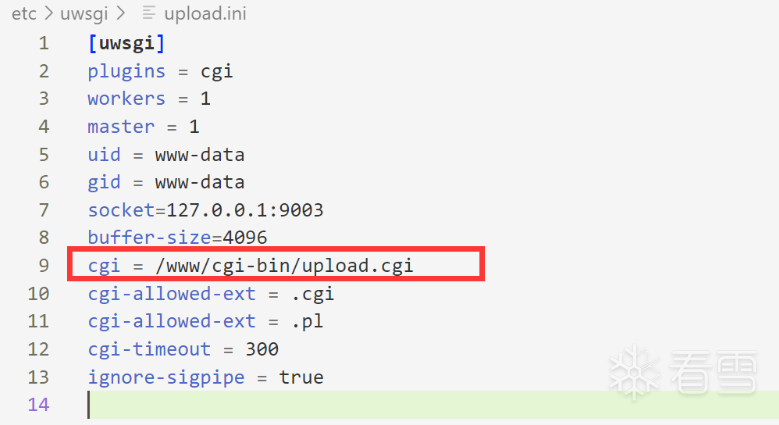 uwsgi -m –ini /etc/uwsgi/upload.ini &在这个进程中会调用upload.cgi进程(为什么是upload.cgi进程呢?因为在配置中记录了要执行的程序路径,如下),调用的方式是先fork了一个子进程,然后execvp来执行upload.cgi。