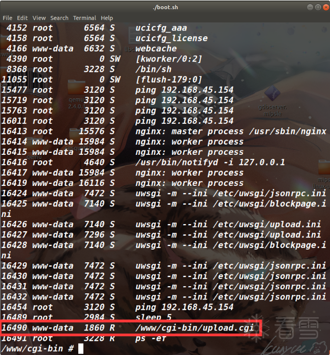 这个原理很好理解,就是写一个shell脚本不断的去捕获upload.cgi进程号,如果捕获到了就立刻去执行gdbserver,缺点是全凭概率,大概率是捕获不到的(感觉有三成的几率用循环能捕获到该进程),并且没法控制断点位置,因为我们无法干预捕获到进程号并加载调试的时间,有可能upload.cgi都快执行完才加载上去啥的,就随机性很大,大概率看不到自己想要的,但也算是一种调试方法。
