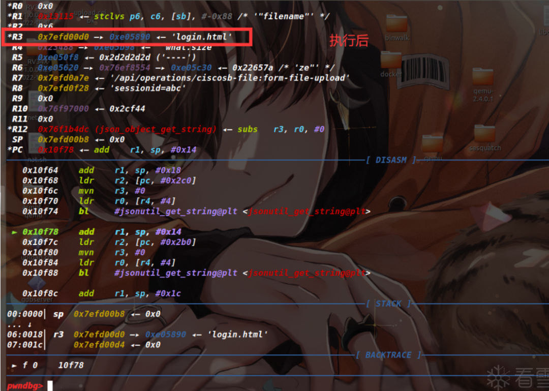 在宿主机中执行sudo gdb-multiarch upload.cgi这里也设置upload.cgi是为了加载出来程序的符号。