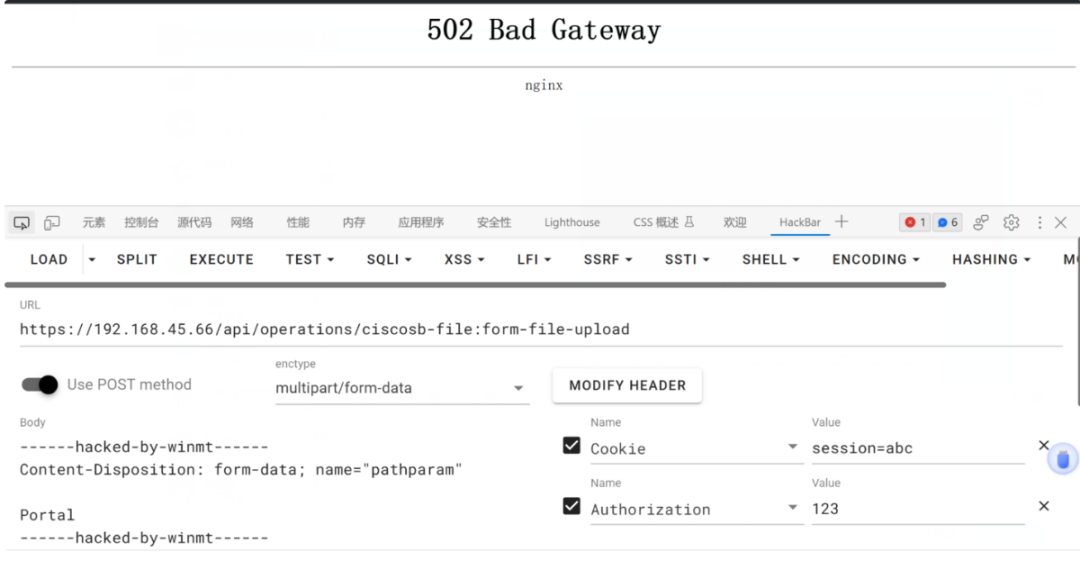 然后将patch完的文件保存后,放到/www/cgi-bin目录下(记得把原本正常的upload.cgi备份),直接重启nginx服务,然后发送攻击报文的话,路由器的界面会出现502错误(如下)。