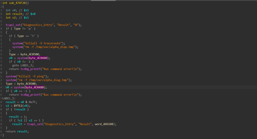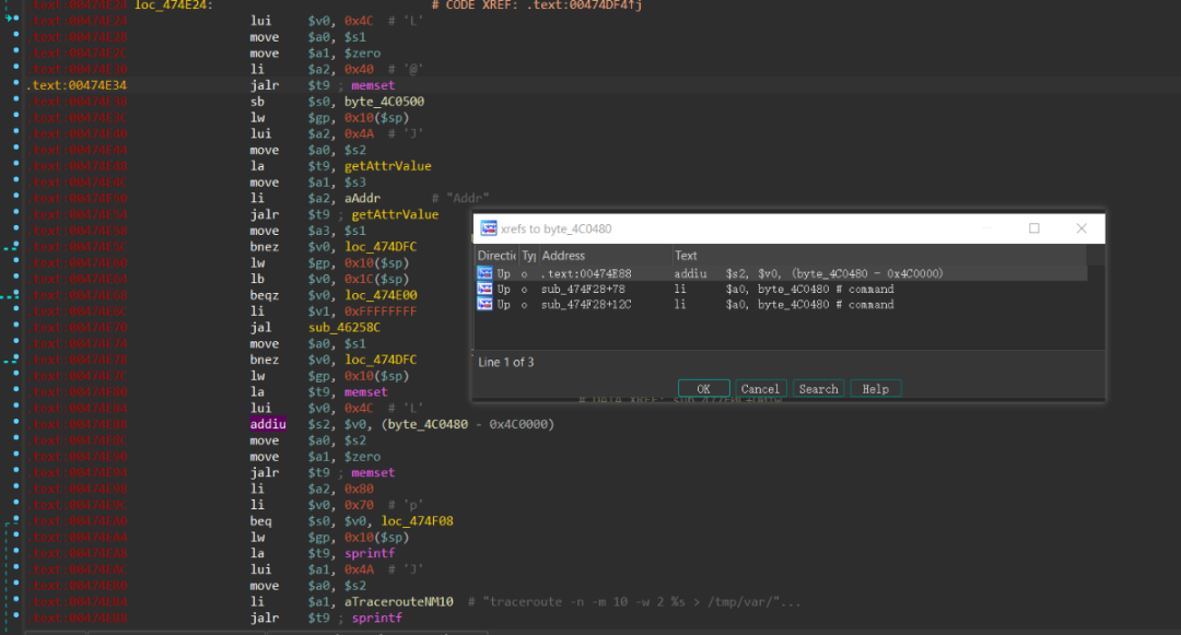 通过分析可知上述代码的含义为判断前端传来的Type参数是为p还是t,对应的是Ping test和Trace route。命令执行的关键点在于byte_4C0480是否能被前端输入所控制,通过引用查看一下byte_4C0480的来源。