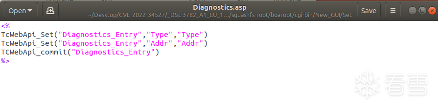 发现ping test 相关文件为:/cgi-bin/New_GUI/Set/Diagnostics.asp,查看一下该文件的内容。