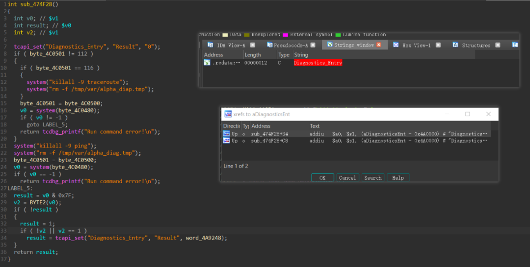 通过查找内容获得文件userfs/bin/cfg_manager,将该文件拿到IDA中分析。通过关键词查找,成功定位到函数: