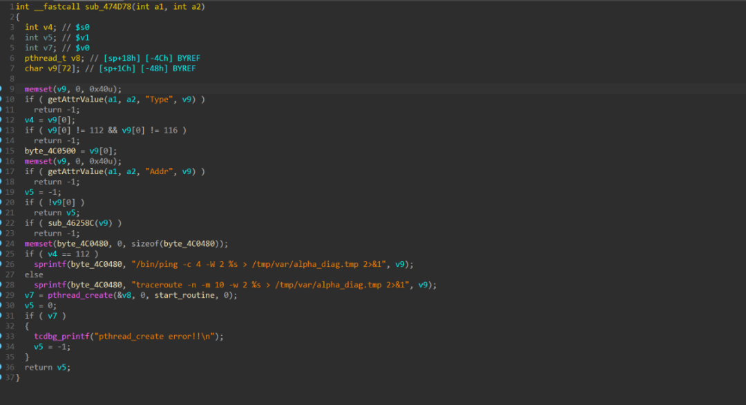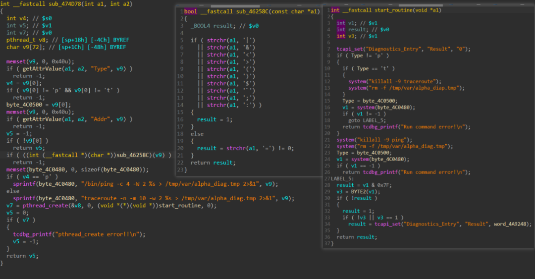 通过分析上述代码可知获取到前端输入的Addr后通过sub_46258C进行字符检查,但是检查不充分,可通过如%0a(\n)绕过。检查后使用sprintf函数拼接命令字符串并通过pthread_create传入到线程回调函数中由system函数执行。这是一个由于对前端输入数据检查不充分导致的命令执行漏洞。