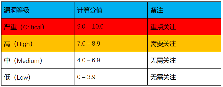 CVSS(Common Vulnerability Scoring System,通用评估漏洞方法),是业界公认的漏洞评估方法,通过对漏洞进行打分将其分为严重(Critical)、高(High)、中(Medium)、低(Low)四个级别。