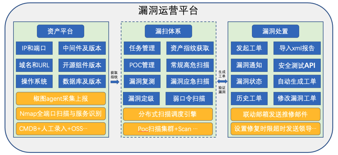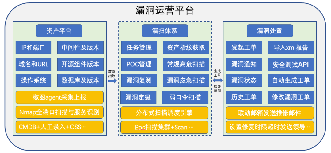 无论是漏洞的发现,亦或是漏洞的修复,均需要明确存在漏洞的资产归属情况,故资产管理是漏洞管理的另一个基础。基于资产(操作系统/应用/组件)进行漏洞扫描,可以提升扫描效率、降低网络流量;基于资产(重要级别/网络位置)进行漏洞修复判断,可以提高必修的漏洞修复率;基于资产(使用人/运维负责人/安全负责人)进行漏洞修复推动,可以提高整体的漏洞修复率。以下为漏洞运营平台结构图,清晰的展示了与资产管理的紧密联系。
