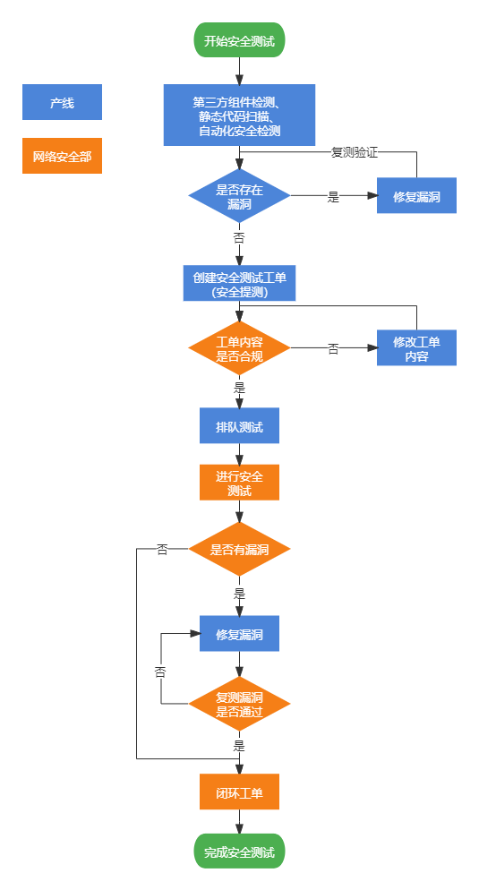 最开始的节点始于产线,在完成自主安全测试并漏洞修复后,可进行安全提测;产线提交安全提测工单后,进入排队待测试状态;安全测试人员分配到安全提测工单后,进入测试中状态;安全测试完成后,由产线进行漏洞修复,提测工单状态为修复中;漏洞修复完毕并经过安全测试人员验证,提测工单状态为安全测试通过。