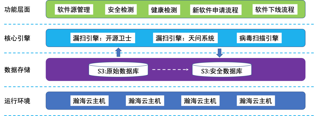 尤其是第三方开源软件,存在较多的未授权、默认口令和已知可利用的CVE漏洞。在使用前依据CIS制定企业级的安全基线,提供给产品线或直接定期维护软件库、镜像源,保障初始状态是默认安全的。在实践中,内部建立了开源软件运营平台来实现这一功能,架构图如下图所示: