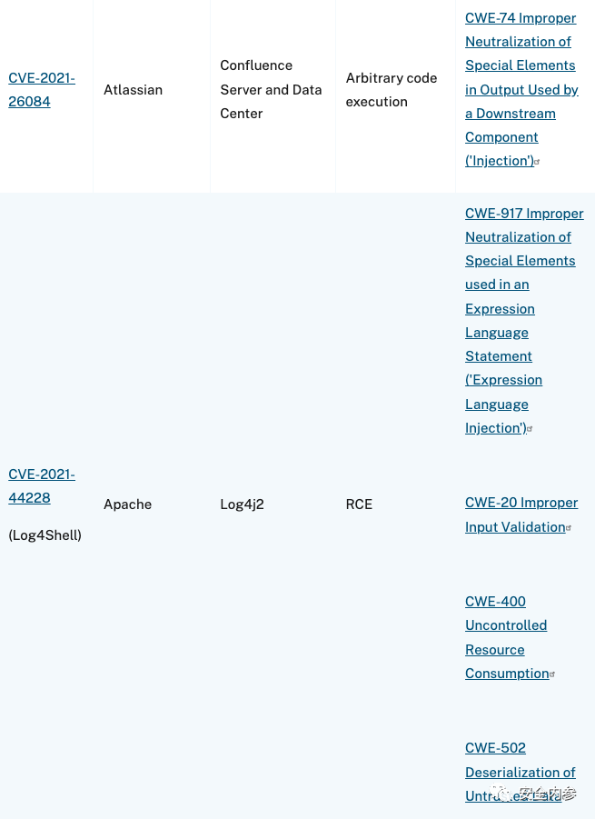 Atlassian的另一个漏洞(CVE-2022-26134)出现在“2022年十二大被利用漏洞”列表末尾。安全公告警告称,“2022年6月被公开披露之前,它很可能最初被作为零日漏洞利用”,并指出它与排名第四的另一个Atlassian漏洞(CVE-2021-26084)有关联。