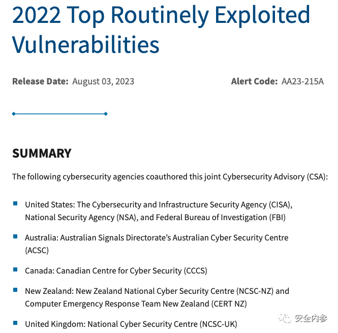 这些网络安全机构非常了解美国、澳大利亚、加拿大、新西兰和英国境内组织受到的网络攻击。咨询公告称,恶意网络攻击者利用较旧软件漏洞的频率高于最近披露的漏洞。