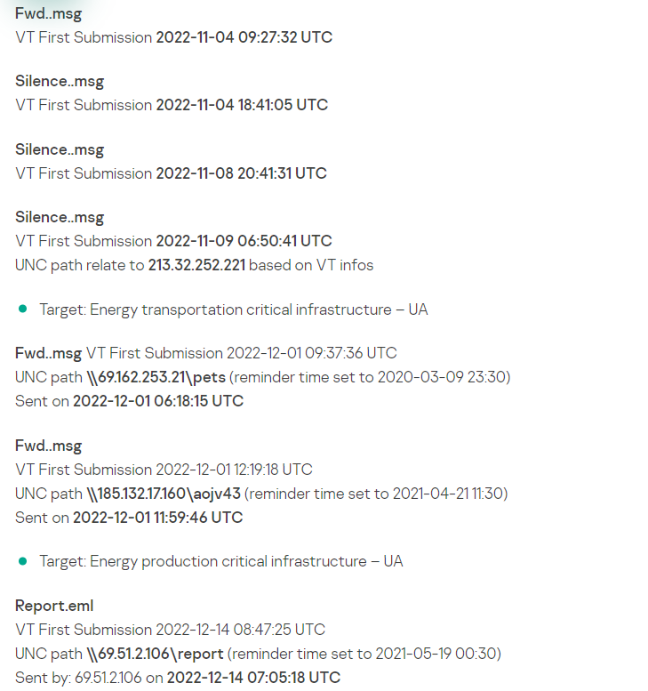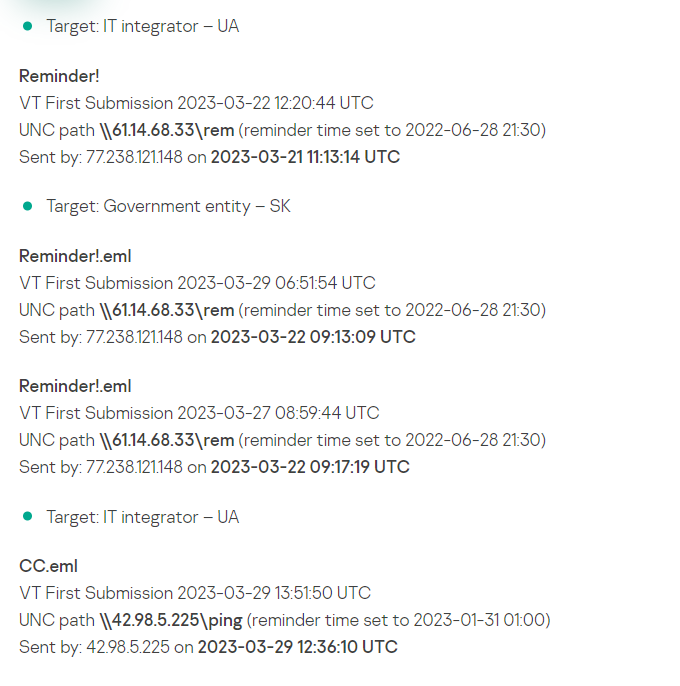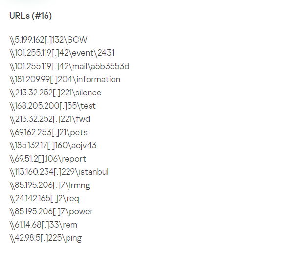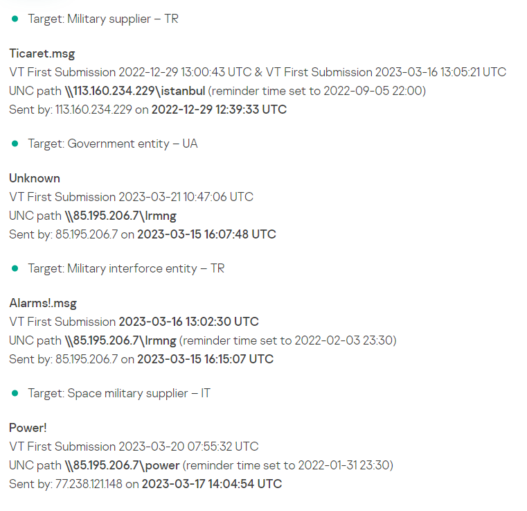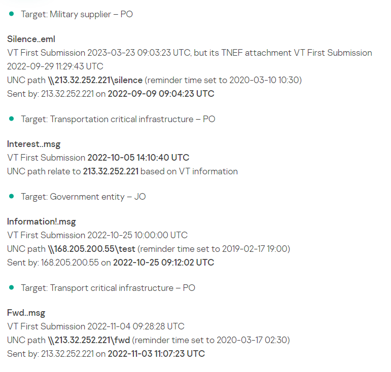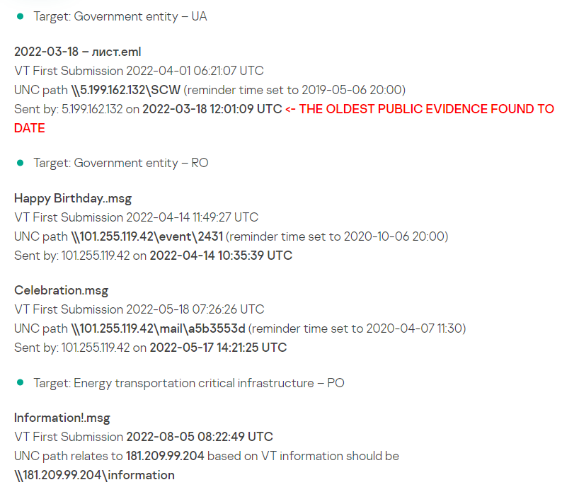 与攻击相关的IOC是嵌入的恶意UNC路径和 IP,注意不是样本文件的哈希,它只是导出的利用漏洞的恶意任务的MSG/EML格式,对攻击检测/验证无用)。