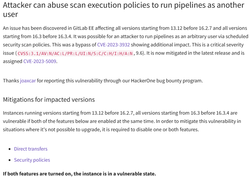 GitLab安全公告中写道:“发现了一个影响GitLab EE(从13.12版本开始到16.2.7之前的所有版本,以及从16.3版本开始到16.3.4之前的所有版本)的问题。攻击者能够通过计划的安全扫描策略以任意用户身份运行流水线。这是对CVE-2023-3932的绕过,显示出额外的影响。这是一个critical级别的高严重性问题。”