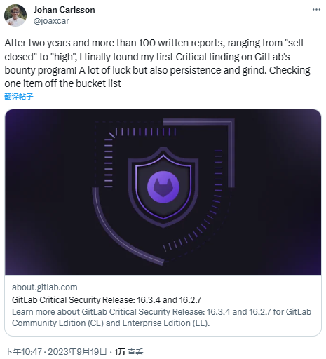 该漏洞由安全研究员Johan Carlsson通过GitLab HackerOne漏洞赏金计划报告。GitLab为此发布了Community Edition(社区版)的16.3.4版本和Enterprise Edition(企业版)的16.2.7版本以修复此漏洞。