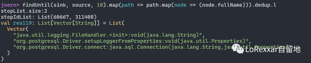 def findUntil(initStep: Traversal[Method], stopStep: Traversal[Method], maxIdx: Int) : List[Vector[Method]] = {    var nextBuffer: List[Vector[Method]] = List()    var finalResult: List[Vector[Method]] = List()    var results: List[Vector[Method]] = List()    val stopList = stopStep.l    val stopIdList = stopList.map(n => n.id).l    println("stopList.size:" + stopList.size)    println("stopIdList: " + stopIdList)    for (idx <- 1 to maxIdx) {        // 第一次查找,使用初始条件作为起始        if (idx == 1) {            for (it <- initStep) {                finalResult = finalResult :+ Vector(it)            }        }        // 处理 finalResult 中的每一条路径,取每条 path 的最后一项调用 caller        for (eachPath <- finalResult) {                        var eachPathIdList = eachPath.filter(n => n.isInstanceOf[Method]).map(n => {                n.asInstanceOf[Method].id            }).l            var newNodes = eachPath.last.asInstanceOf[Method].caller.dedup            for (newNode <- newNodes) {                // 检查 newPath 是否存在环,如果存在,则跳过,如果不存在,加到结果列表中                if (!eachPathIdList.contains(newNode.id)) {                    val newPath = eachPath :+ newNode                    nextBuffer = nextBuffer :+ newPath                    // 检查是否满足终结条件,如果满足,就加到resutls里                    if (stopIdList.contains(newNode.id)) {                        results = results :+ newPath                    }                }            }        }        // 所有的路径都处理完了,结果放在 nextBuffer 中        finalResult = nextBuffer        nextBuffer = List()    }    return results}