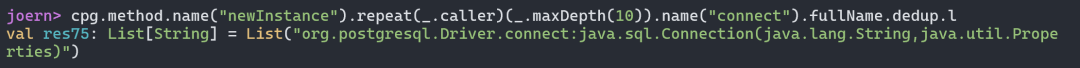 cpg.method.name("newInstance").repeat(_.caller)(_.maxDepth(10)).name("connect").fullName.dedup.l