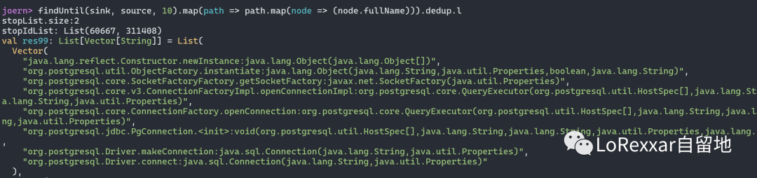 当然这里找到的类是不全的,这里的问题和前面类似。Joern不会解jar包里的jar包,所以无法跟进去分析整个项目的依赖,自然也就没办法找到完整的利用点,这里不赘述了