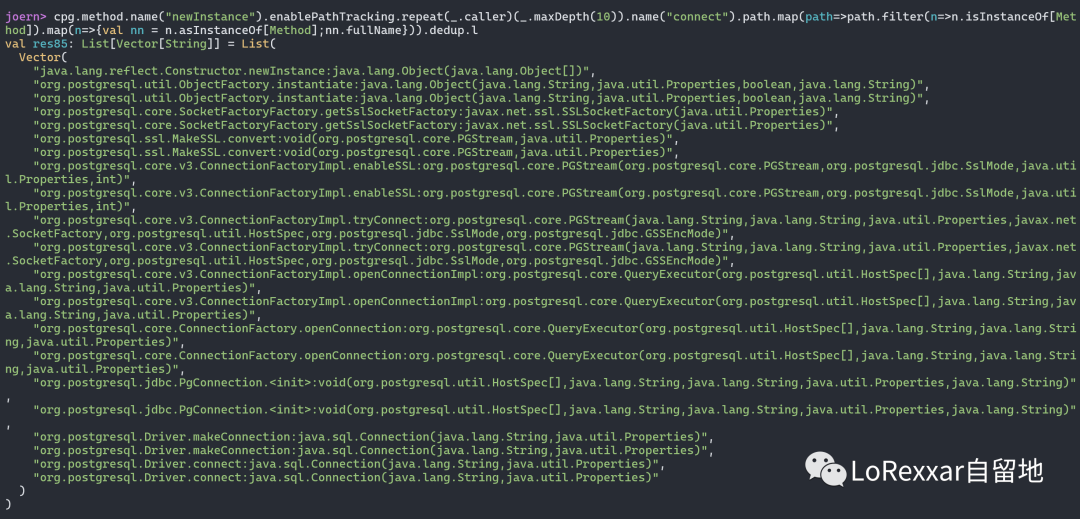 def sink = cpg.method.name("newInstance")def source = cpg.method.name("connect")findUntil(sink, source, 10).map(path => path.map(node => (node.fullName))).dedup.l