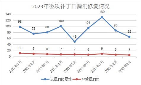 从漏洞数量来看,今年相较去年减少。微软在2023年9月份爆发的漏洞相较于去年减少。本月出现了65个漏洞补丁,并且有5个 Critical 类型的漏洞补丁。