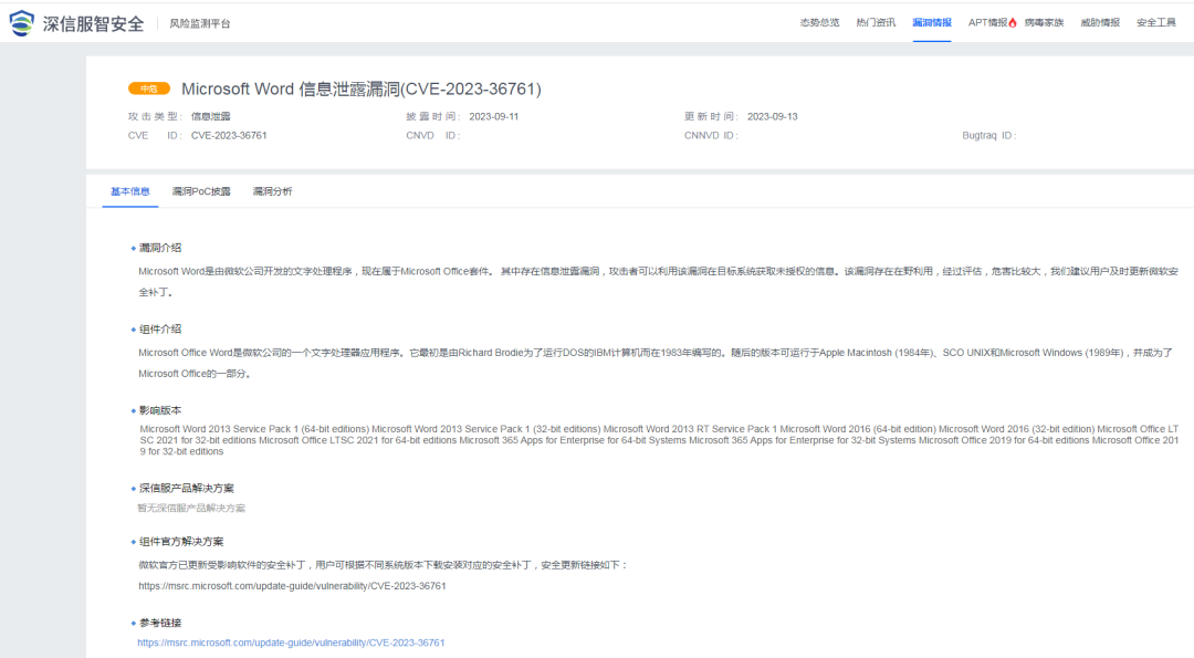 Microsoft Word 信息泄露漏洞 CVE-2023-36761 |