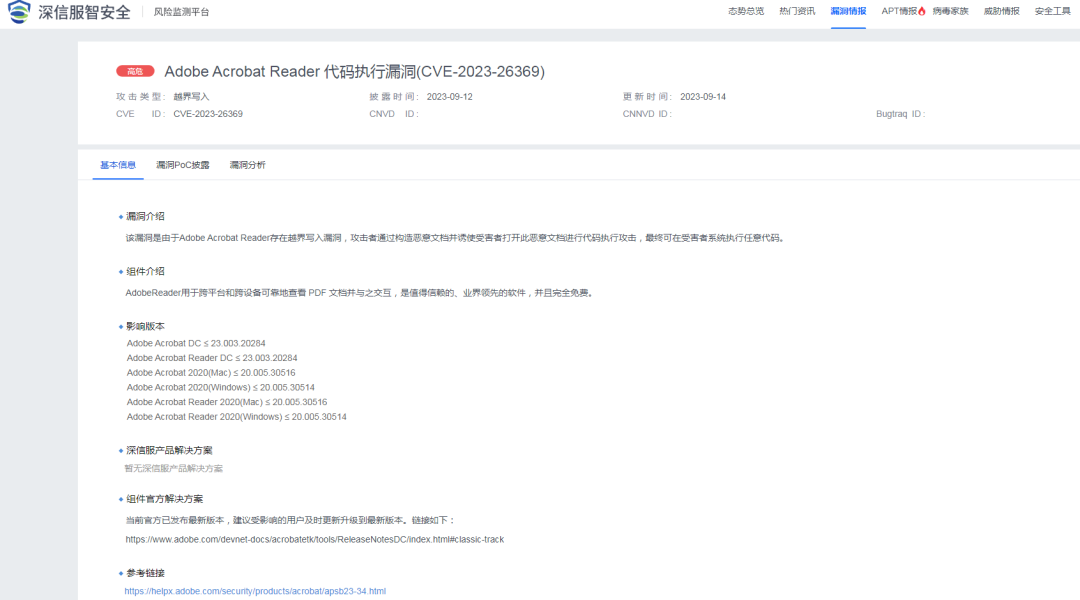 2023年9月15日,深信服安全团队监测到一则Adobe Acrobat Reader组件存在代码执行漏洞的信息,漏洞编号:(CVE-2023-26369),漏洞威胁等级:高危。