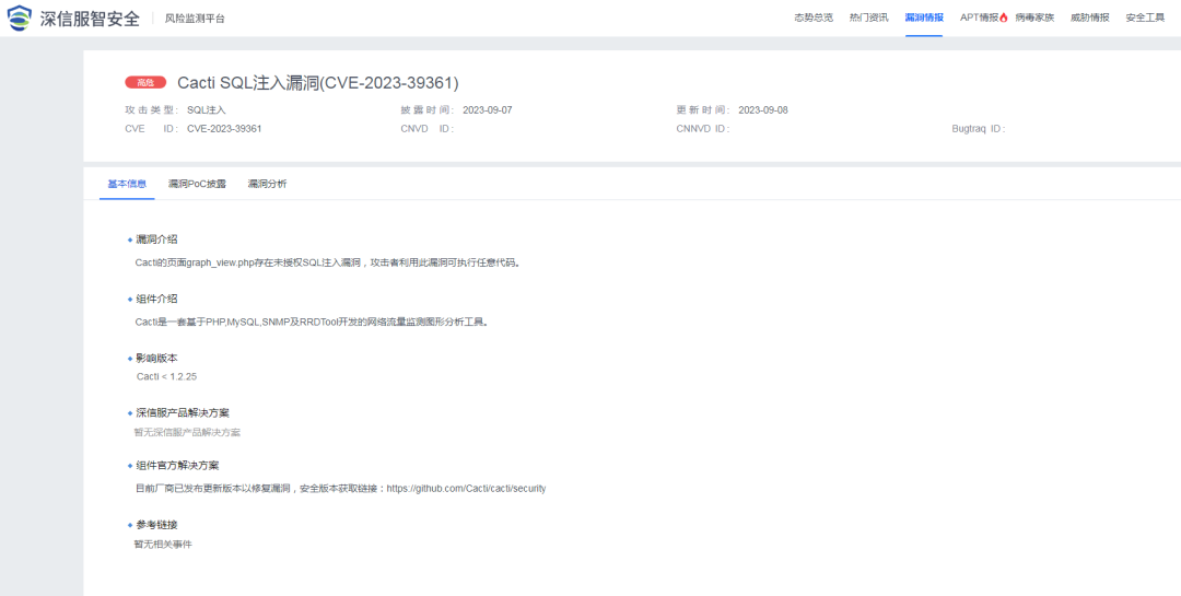 深信服监测到Cacti SQL注入漏洞(CVE-2023-39361)攻击信息。