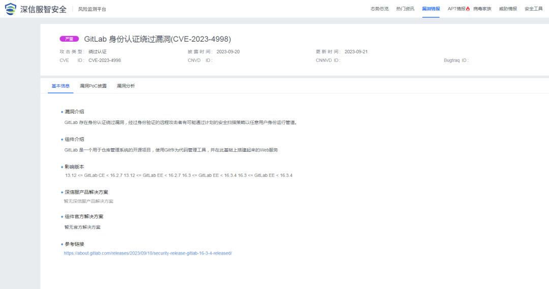深信服监测到GitLab 身份认证绕过漏洞(CVE-2023-4998)信息。