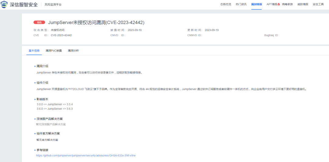 2023年9月19日,深信服安全团队监测到一则JumpServer组件存在未授权访问漏洞的信息,漏洞编号:(CVE-2023-42442),漏洞威胁等级:高危。