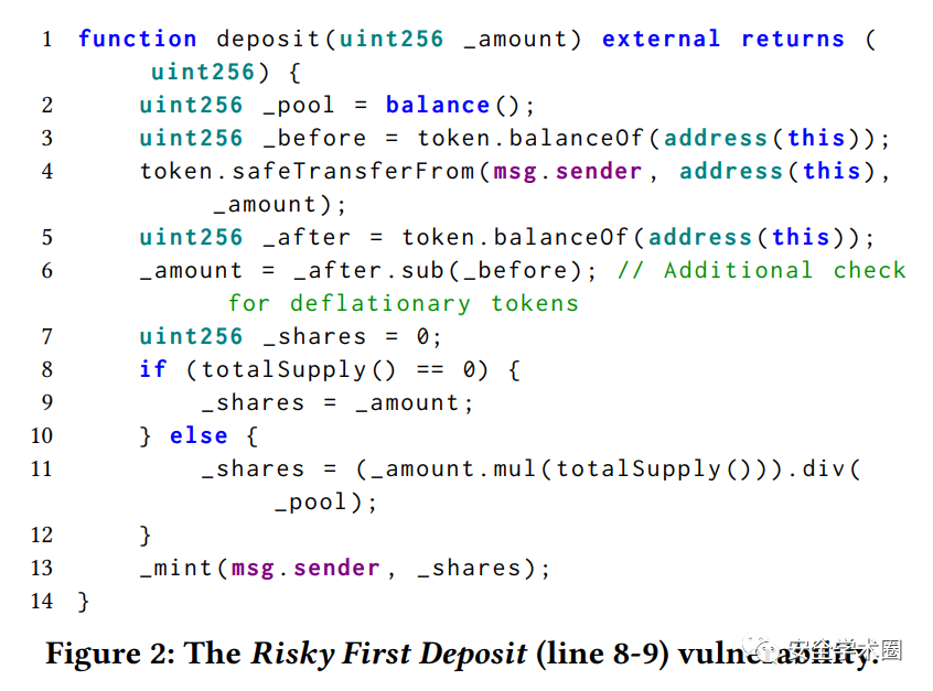 在上述案例中,实现了一个存款(deposit)的操作。当流动性池的余额为0时,share会被设置成存款总数。因此,第一个存款人可以存入很少的钱并占据所有的share,之后转入一大笔使share价格通胀,从而获取不正当利益。对于静态分析的检测方法来说,难点在于如何判断业务场景并识别出关键变量。
