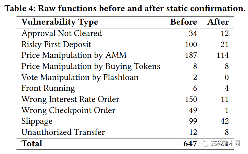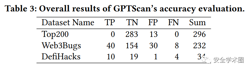 作者在三个数据集上进行了实验,结果如上图所示。在Top200上,误报率为4.39%;在Web3Bugs上,精确度为57.14%;在DefiHacks上,精确度为90.91%。