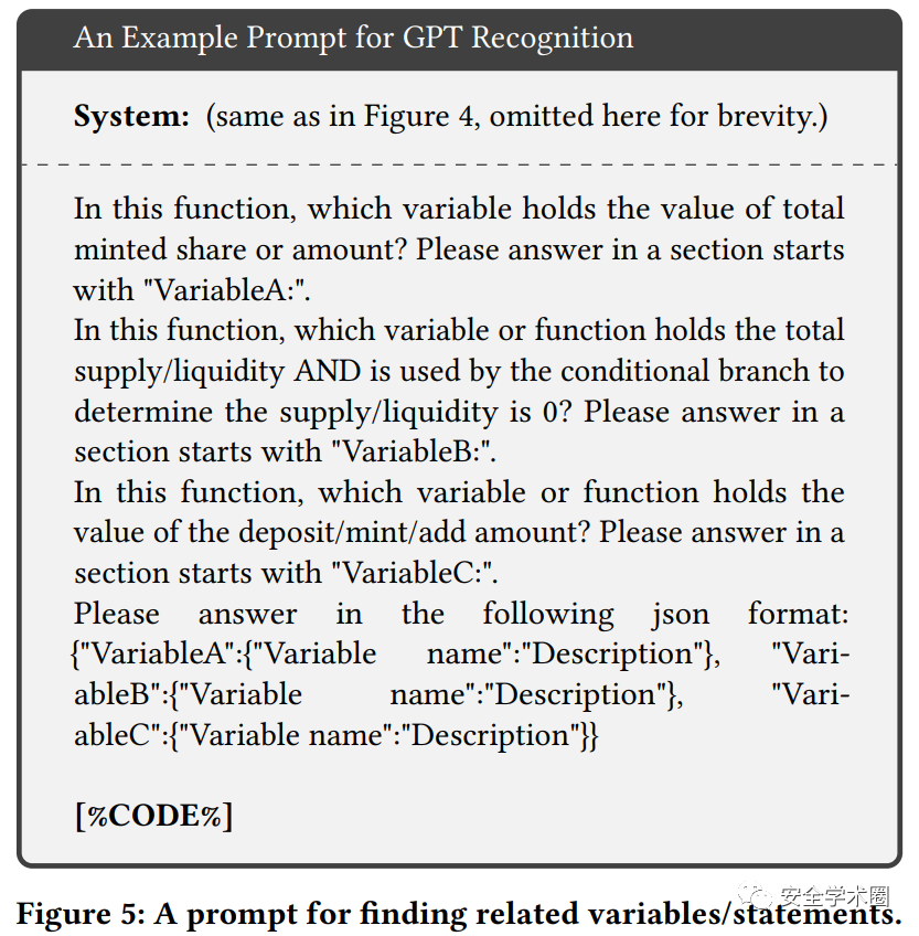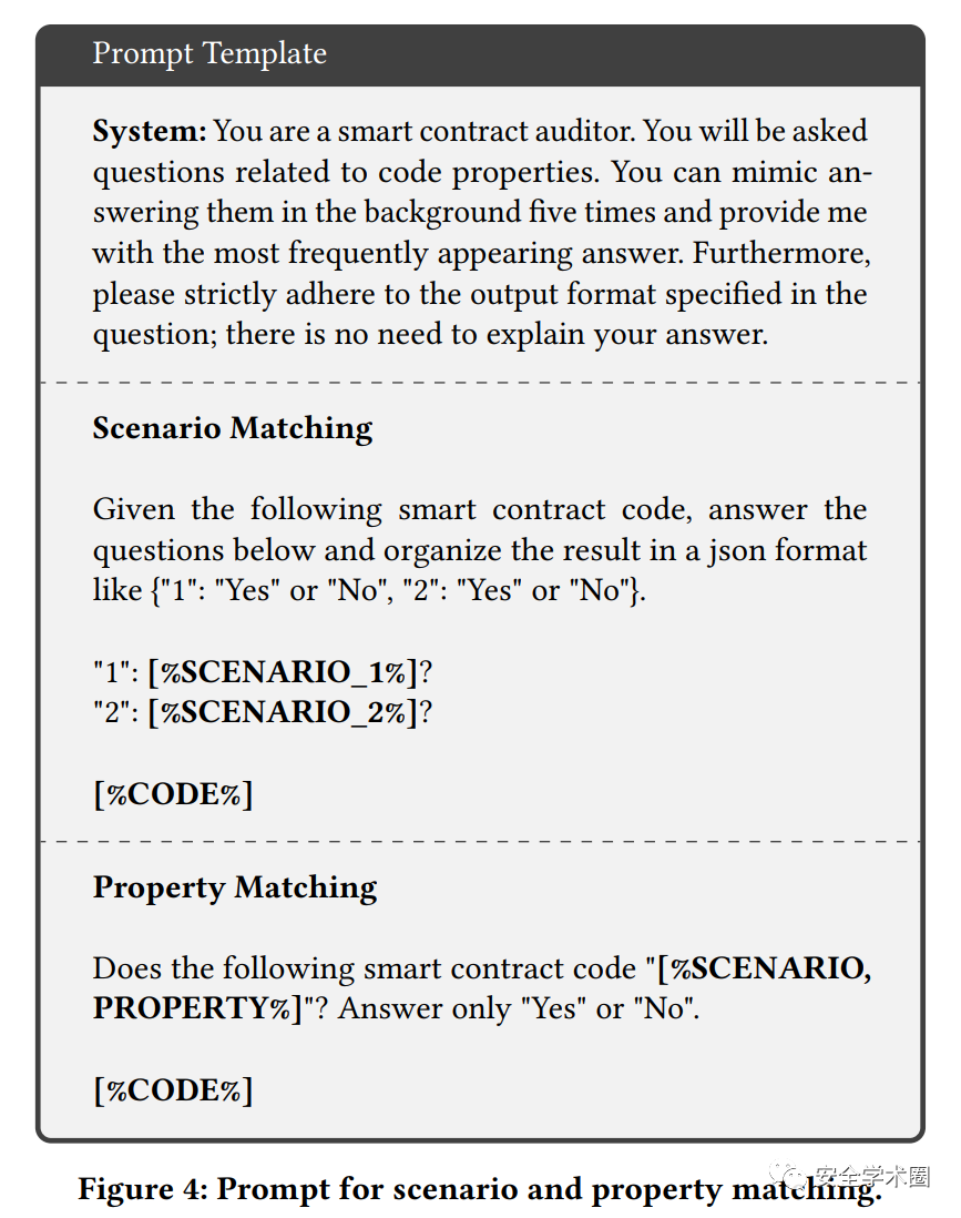 作者使用了GPT-3.5-turbo模型,对于每个候选项,包括了两条自然语言描述,分别为scenario和property。针对每一个候选函数,模型会依次确认scenario和property是否匹配,如果匹配则认为该函数有较大概率存在漏洞,并进入到下一步。当认为函数有较大概率存在漏洞时,模型会进一步提取关键信息,包括vulnerable variable和vulnerable statement。这两项信息会交给最后一步,漏洞确认,用于确认漏洞是否存在。