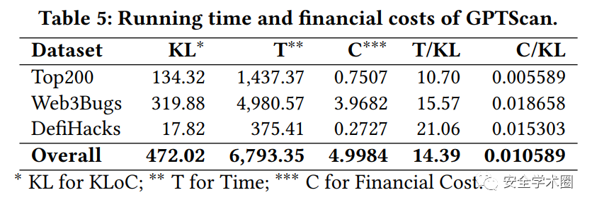 作者使用了GPT-3.5-turbo模型,在三个数据集共472K行代码上进行了实验。总耗时约6793秒,平均每千行代码耗时14.4秒;总共花费约5美元,平均每千行代码花费10.6美分(0.0010589美元)。相比于人工审计来说,AI辅助的漏洞检测可以大大降低成本。