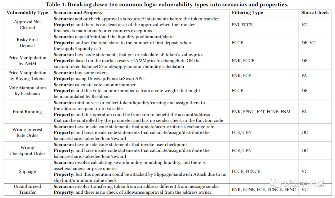 作者一共总结了10条规则,共对应了9个漏洞类型,包括授权未被清除、不安全的第一个存款人(案例中展示的漏洞)、基于AMM的价格操纵、基于购买或交换代币的价格操纵、投票操纵、抢跑、错误执行顺序、滑点和未经授权的转账。每一条规则包含四个部分,即两条自然语言描述,一些静态过滤器和一条静态确认器。