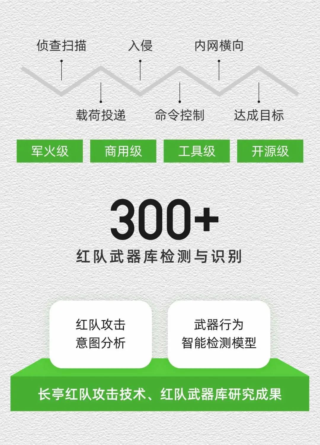全悉(T-ANSWER)基于长亭红队武器研究成果和长期的攻防实战积累,打造了全面的红队武器检测库,覆盖远程控制、代理隧道、漏洞利用等不同阶段和类型的自动化攻击工具,如FireEye、Equation、APT34等泄漏工具集,支持超过300种红队武器检测,能够有效应对红队自定义协议武器利用、武器变形与二次开发。