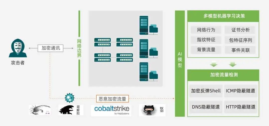 全悉(T-ANSWER)采用AI建模方式,在加密流量不解密的场景下,通过对恶意加密流量的证书交互、时序特征、网络行为、人机交互特征等不同维度数据进行建模,有效识别加密入侵与通信行为。目前,全悉(T-ANSWER)支持检测上百种加密攻击工具、20+种加密攻击检测模型,可对不同类型的恶意加密流量实现精确检测。