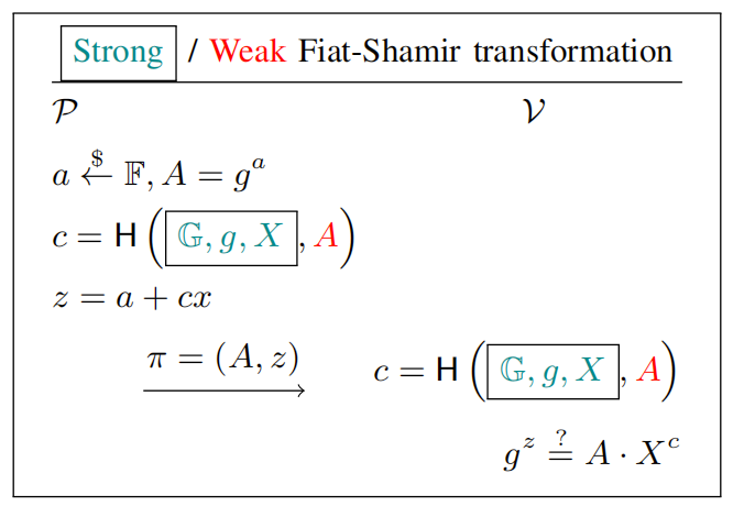 这就存在一个安全问题,我们称它为弱 Fiat-Shamir 变换,它可以被用于伪造证明,通过预计算 A,欺骗验证者。