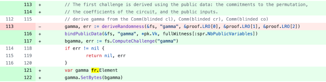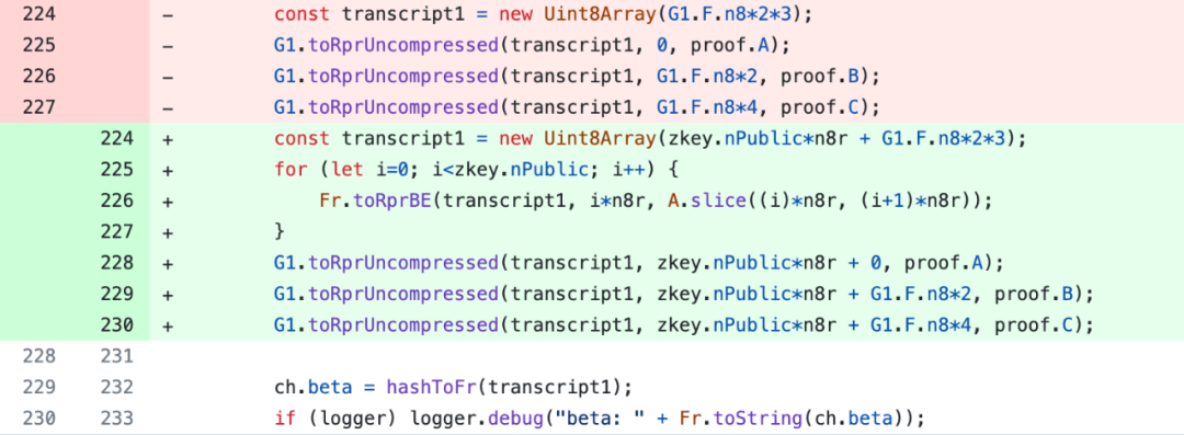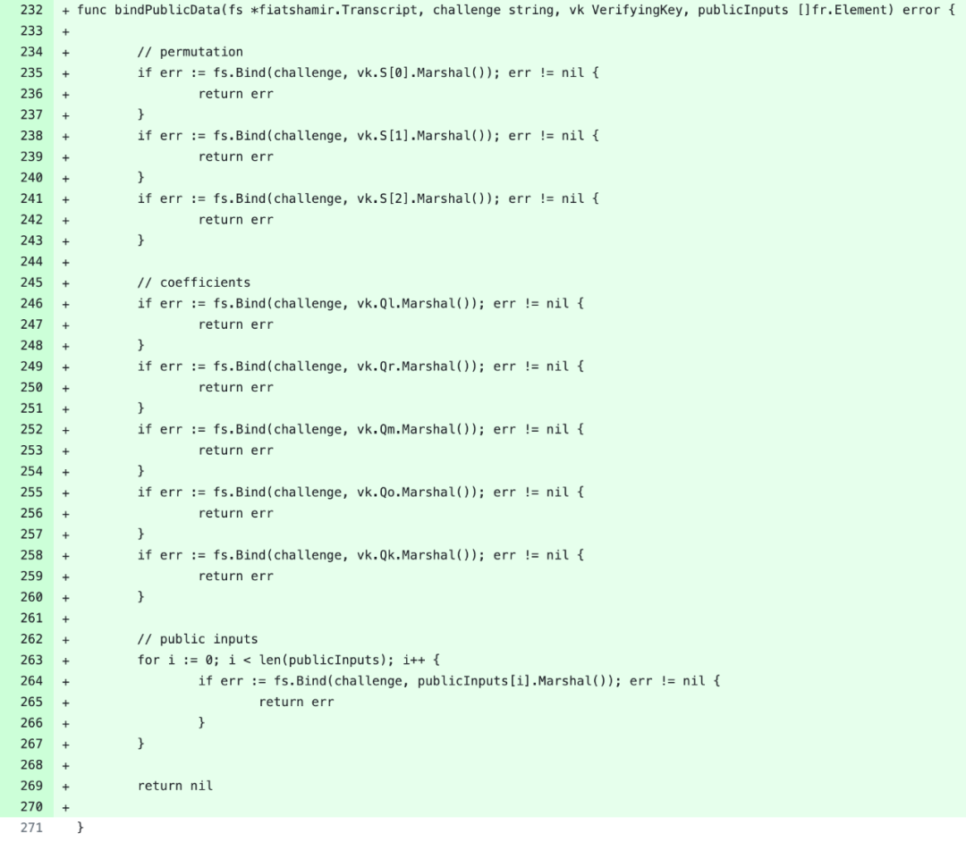 这里 fs 就是一个 Fiat-Shamir 计算实例,在 Round2 证明计算 z(X) 参数时,由于没有将公共输入绑定到 challenge,导致了可以伪造证明信息。