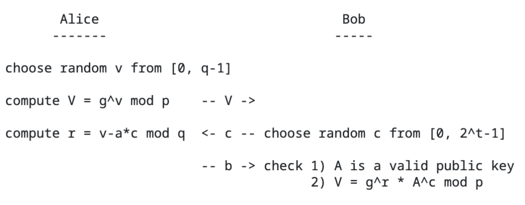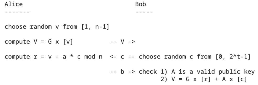 接着,Alice 在不公开 a 的情况下,向 Bob 证明她知道 A 对应的私钥 a: