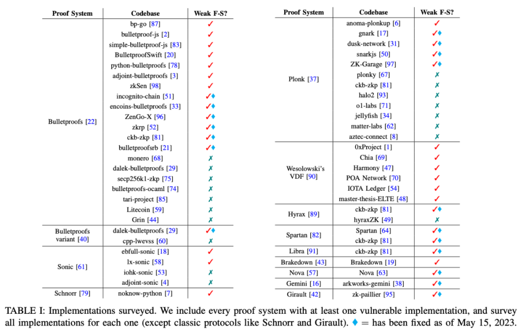 中调查了许多现代零知识证明系统的开源实现,发现有 36 个使用了弱 Fiat-Shamir 变换,包括 Bulletproofs、Plonk、Spartan 和 Wesolowski 的 VDF 等。攻击者可以生成通过验证的证明,而不需要知道有效的证明秘密。