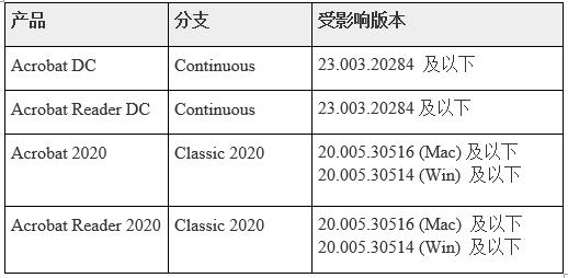 攻击者在成功利用一个界外写漏洞后,可利用该漏洞获得代码执行权限。Adobe 将该漏洞的评级为满分,并强烈建议管理员尽快在72小时时间窗口内修复该漏洞。该漏洞影响的产品如下: