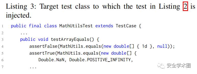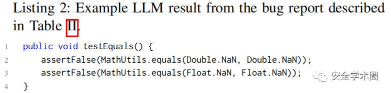 对于Listing 1中的提示,LLM的输出示例如Listing 2所示。此时,LLM输出通常无法单独编译,需要其他构造,如:导入语句。因此,需要将生成的测试集成到现有的测试套件中,使其可执行。