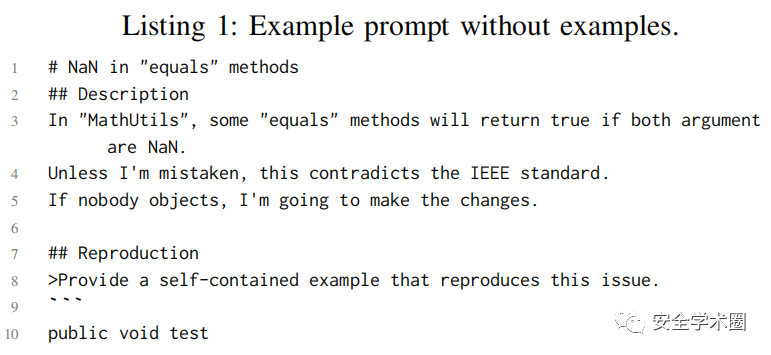 为了让LLM从一个给定的错误报告中生成一个测试方法,我们从错误报告中构造了一个Markdown文档,它将在提示中使用:考虑Listing 1中的例子,这是一个从表2所示的bug报告中构造的Markdown文档。LIBRO在Markdown文档中添加了几个独特的部分:(1)命令“提供一个重现该问题的自包含示例”;(2)Markdown中代码块的开始,(即“`):(3)部分代码片段