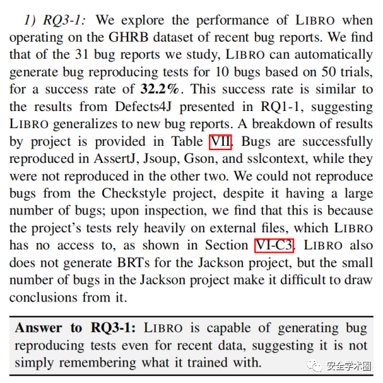 【由于LIBRO特定的模板格式使得生成的提示不太可能逐字存在于LLM训练数据中。此外,实践中的大多数报告仅仅通过一个参考链与暴露缺陷的测试相联系。因此,LIBRO提示模板的格式在一定程度上减轻了数据泄露的担忧。】