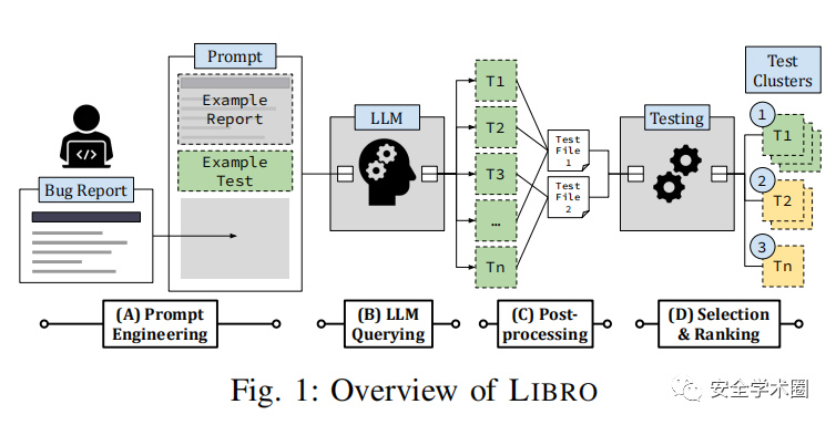 LIBRO模型的框架如图1所示。给定一个bug报告,LIBRO首先构建一个提示(prompt)来查询一个LLM(